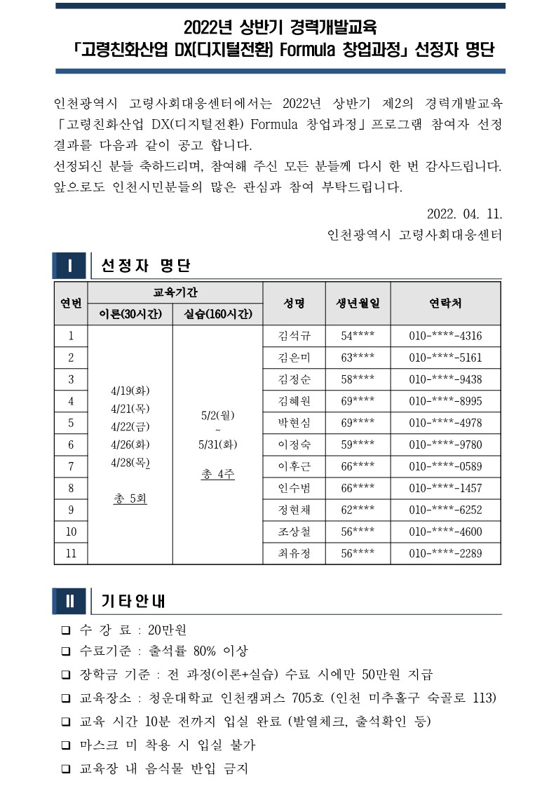 2022년 상반기 경력개발교육 [고령친화산업 DX(디지털전환) Formula 창업과정] 선정 결과 공고
