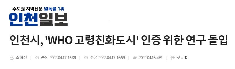 인천시, 'WHO 고령친화도시' 인증 위한 연구 돌입